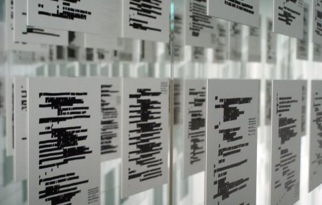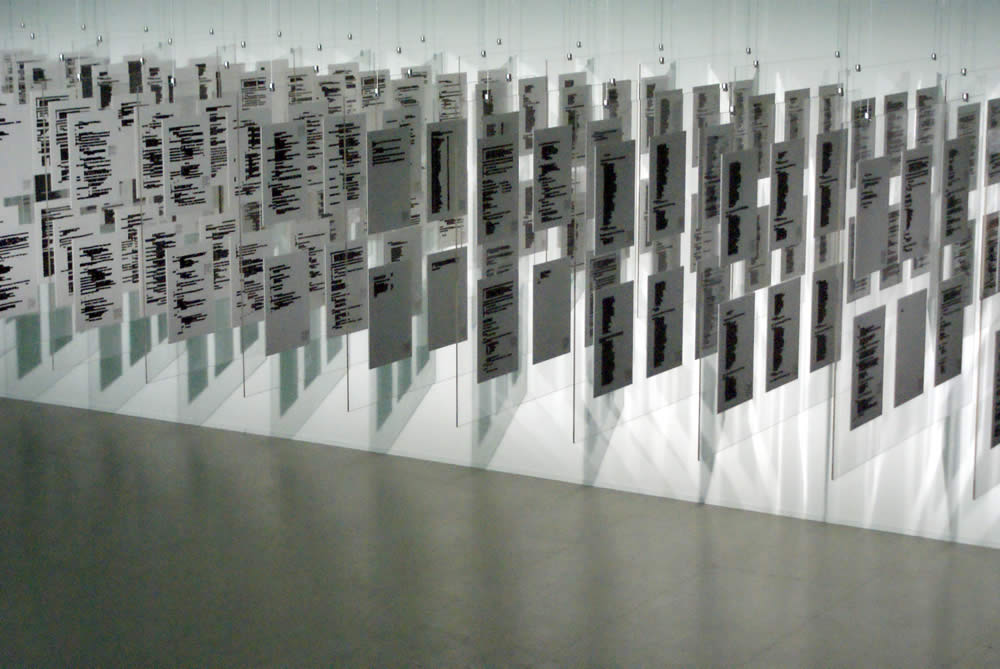 La pièce cache donc l’information qu’elle montre. Elle est clairement dans une esthétique post-conceptuelle, mais cette hyperprésence de l’absence est savamment théâtralisée : les pages disposées par paquets ont la beauté d’une installation minimale, crée un volume constitué de peu de matière, amplifié par les plaques réfléchissantes et le jeu des ombres portées.