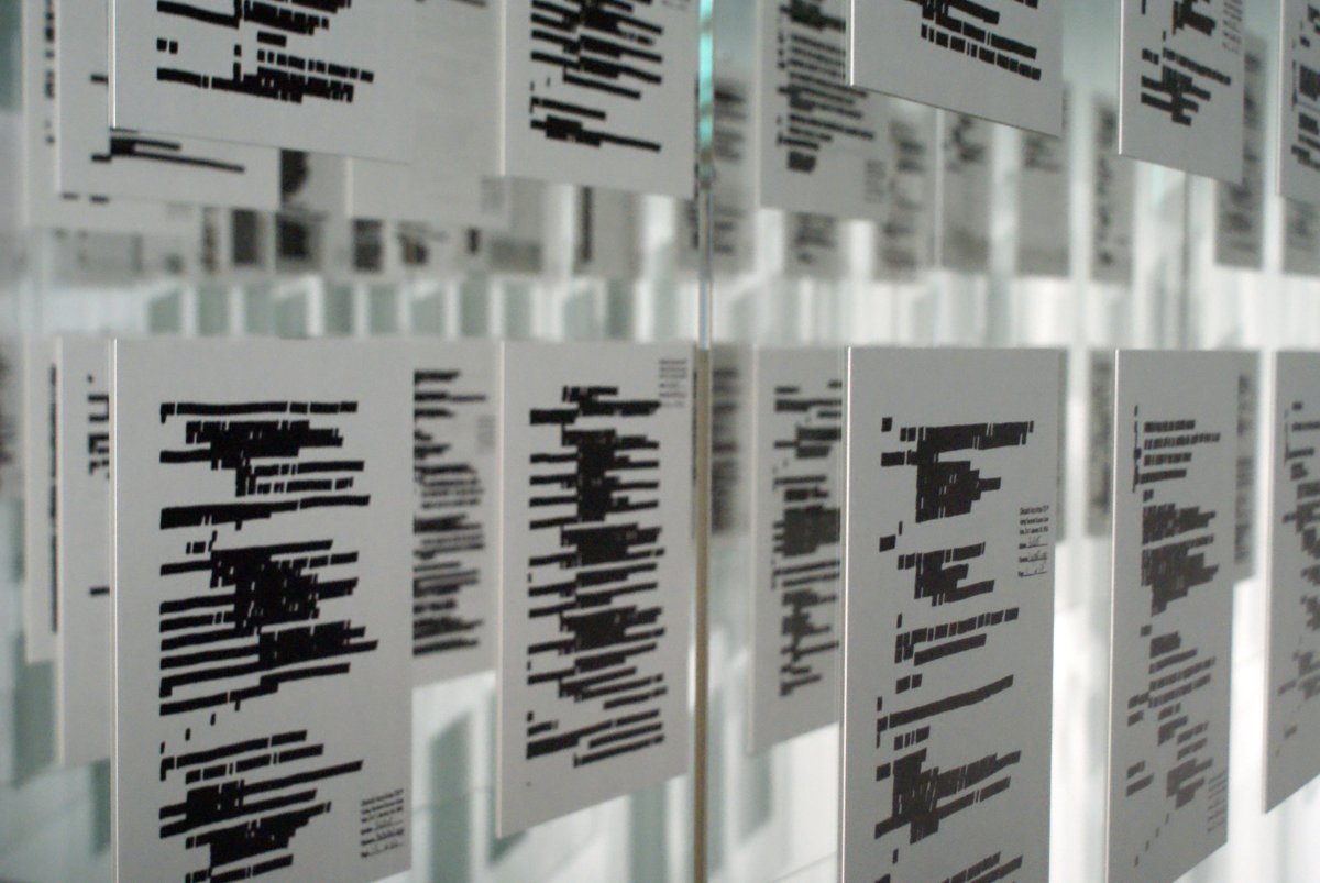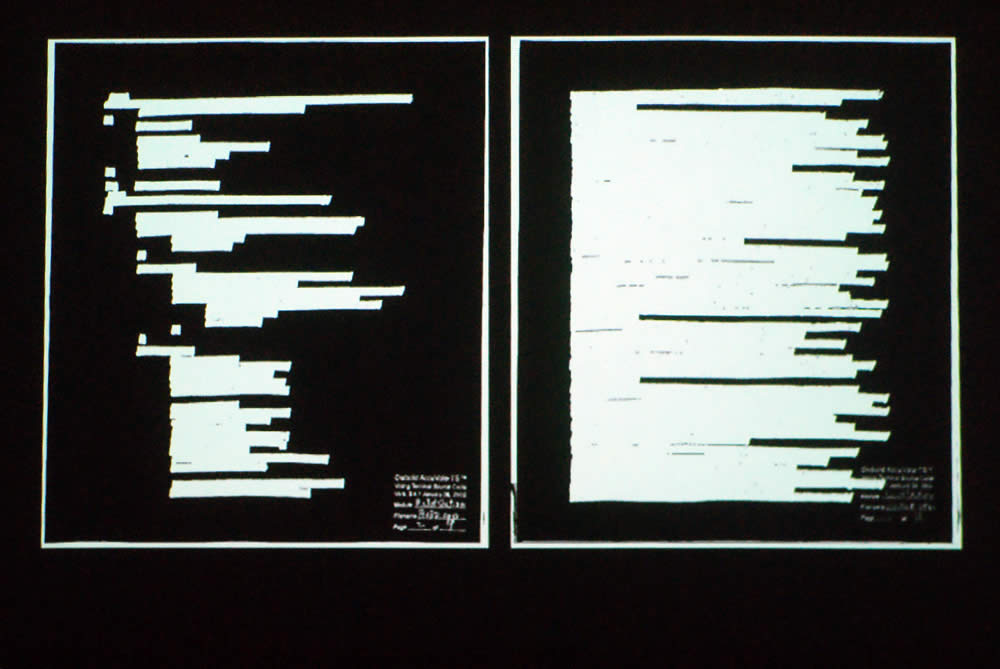Profitant d’une faille de sécurité dans le système serveur de Diebold, Rubin a obtenu le code source de la version 4.3.1 du logiciel. Il est donc tiré sur papier et placé sur microfilm dans la pièce d’exposition. Mais comme ce code est propriété privée de la firme et ne peut pas être rendu public, Rubin a effacé au marqueur noir, manuellement donc, chacune des 49.609 lignes de C++. Et cela aussi bien sur les feuilles que sur les microfilms.