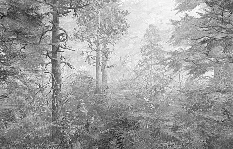 Fortement ancrées dans la tradition romantique du paysage, ces images sont créées avec un logiciel de 3D. Un examen rapide des traits raides et réguliers nous en fait prendre conscience, mais la magie de l’image continue à fonctionner une fois le procédé devenu évident. La force de la composition, la finesse des gris, le flou atmosphérique nous met clairement en présence d’un paysage qui noue avec la tradition de la peinture, et le regard est capturé par des espaces complexes, sauvages, ironiquement intouchés.