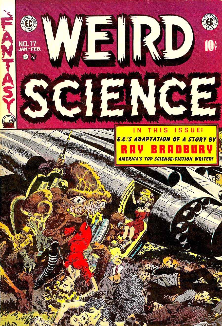 Cette couverture de Weird Science des années 50, frappe d’abord par l’écart entre les corps des humains et des aliens, opposés à la surface étincelante et régulière de la machine.
