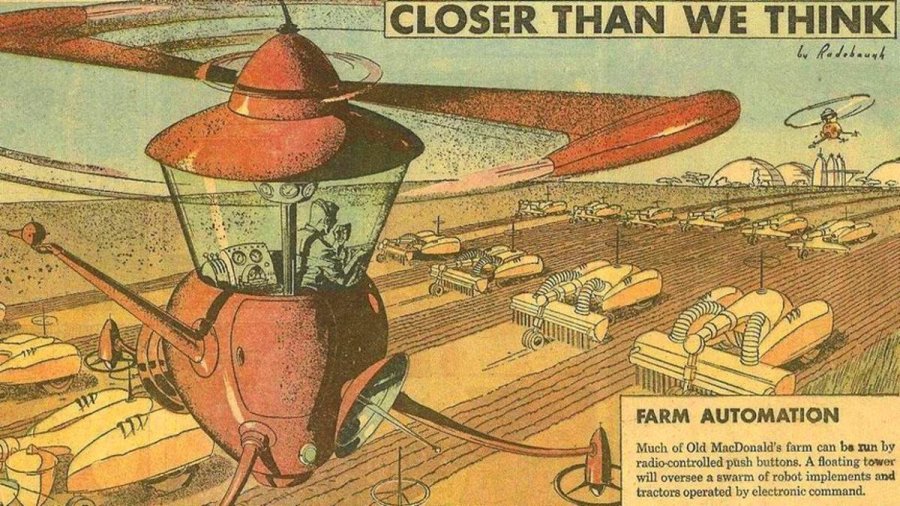 Cette autre image, de la même époque, imagine un monde refaçonné par la machine, où la nature est pliée à l’esthétique de la machine : relief uniformisé, lignes droites, couleurs homogènes. "Closer than we think" est visionnaire : les machines agricoles contemporaines sont pilotées par GPS, avec une marge d’erreur de quelques centimètres.
