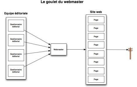 Lorsqu’un site web est "statique", c’est à dire construit en html et css pur, sans base de donnée ni code d’exécution, il est généralement maintenu par une personne, le webmaster. Celui-ci travaille généralement sur une version du site sur son ordinateur personnel, et uploade les mises à jour par ftp. Ceci signifie que toutes les modifications à apporter au site passent par lui, quel que soit le nombre de personnes qui s’occupent des contenus.