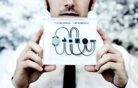 Le "1-bit symphony" de Perich est à la fois une oeuvre sonore, du physical computing et du design. Un boitier CD de modèle fin, transparent, laissant voir quelques composants soudés à la main, alignés à intervalles réguliers : une pile, un interrupteur, une puce, un bouton à presser, un potentiomètre et une prise minijack collée au bord droit du boitier. On y place une paire d’écouteurs, on glisse l’interrupteur sur "on" et un flot sonore s’écoule, soutenu, repétitif mais structuré. Des nappes sonores qui rappellent certaines pièces de Steve Reich ou John Adams. On y retrouve des patterns, des syncopes, des boucles et des permutations. On est en fait plutôt étonné, vu le minimalisme de l’objet, d’y trouver de la musique. C’est que la pièce relève de ce que l’on appelle le "chiptune", elle est produite directement par la puce électronique, modulant du son uniquement en ouvrant et coupant l’alimentation électrique à très grande vitesse.
