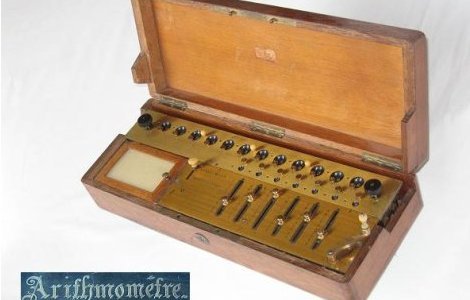 La première machine à calculer est l’Arithmomètre commercialisée vers 1851, et qui trouve sa place dans de nombreux bureaux comptables. Capables d’additionner, soustraire, multiplier et diviser grâce au cylindre cannelé du philosophe Leibniz. C’est un succès industriel, les calculatrices sont clonées par de nombreux fabricants en Europe et en Amérique. Le déplace des curseurs, puis tourne une manivelle et le résultat s’affiche. L’arithmomètre réalise une seule opération à la fois.