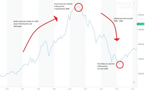 En mars 2000, explose la bulle spéculative des "valeurs technologiques", appelée "bulle internet" liée à l’informatique et aux télécommunications, qui avait grossi sur les marchés d’actions à la fin des années 1990. Son apogée a eu lieu en mars 2000.