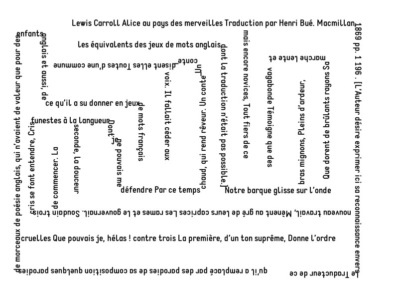 Ce code dissocie le texte en une longue série de mots puis les écrits dans l’espace de la fenêtre en respectant leur longueur, et en restant à angle droit. La barre d’espacement permet de démarrer ou stopper le processus d’écriture, permettant de déplacer le point d’écriture à différents endroits de la surface.