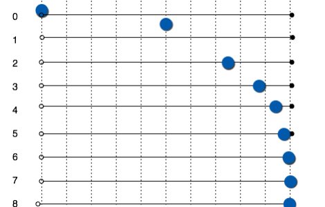 A chaque fois que processing va exécuter la fonction draw(), une trentaine de fois par seconde donc, il va approcher la balle vers le point d’arrivée. L’astuce est qu’il va effectuer non pas un déplacement fixe (un pixel à chaque fois par exemple) mais une fraction de l’espace qu’il lui reste à parcourir. Imaginons qu’il fasse à chaque fois la moitié du temps qu’il lui reste à parcourir. Cela donnerait ceci :