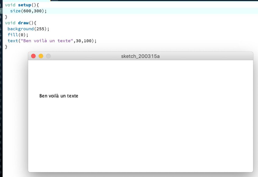 Par défaut, Processing affiche le texte en blanc. Cette couleur est déterminée par la fonction fill(). Il est donc recommandé de choisir la couleur de fond de la fenêtre et du texte avec background() et fill().